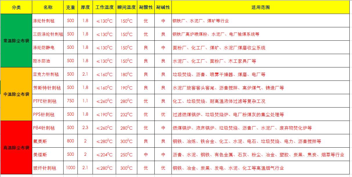 常用的除塵布袋主要是按照溫度來進行分類,有以下幾種規(guī)格: